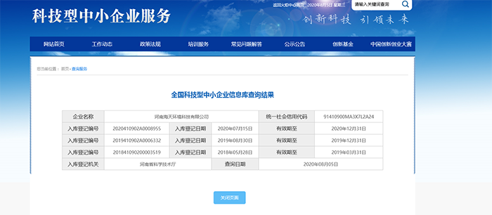 7月15日,經(jīng)河南省科學(xué)技術(shù)廳審核公示,河南海天環(huán)境科技有限公司成功入庫(kù)科技型中小企業(yè)信息庫(kù)。