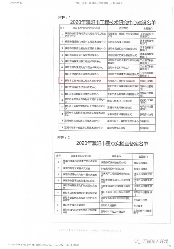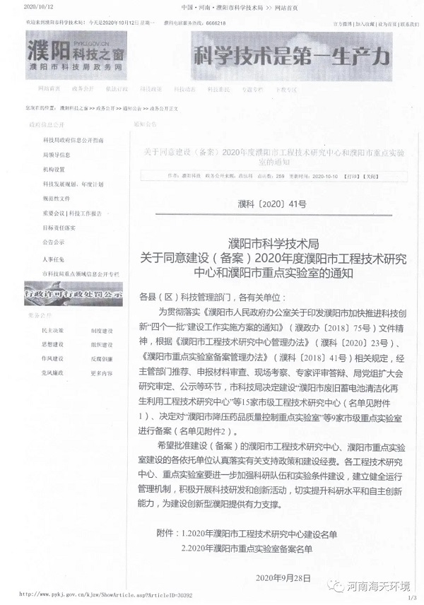 根據(jù)《濮陽(yáng)市工程技術(shù)研究中心管理辦法》(濮科〔2020〕23號(hào))、《濮陽(yáng)市重點(diǎn)實(shí)驗(yàn)室備案管理辦法》(濮科〔2018〕41號(hào))相關(guān)規(guī)定,經(jīng)主管部門(mén)推薦、申報(bào)材料審查、現(xiàn)場(chǎng)考察、專(zhuān)家評(píng)審答辯、局黨組擴(kuò)大會(huì)研究審定、公示等環(huán)節(jié),我公司“濮陽(yáng)市工業(yè)水處理工程技術(shù)研究中心”申報(bào)成功,濮陽(yáng)市科技局同意建設(shè)(備案)。