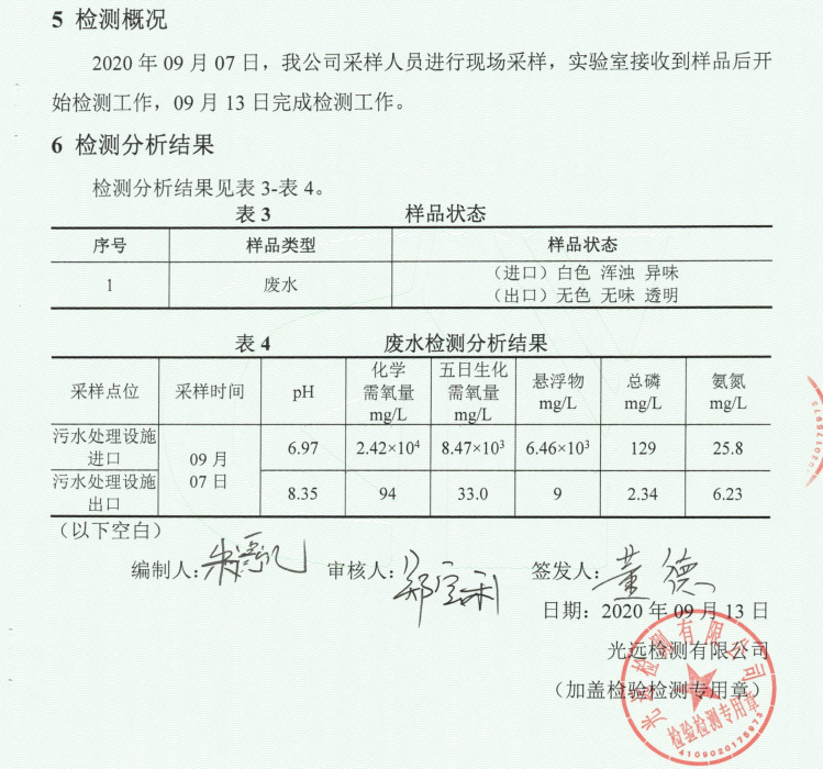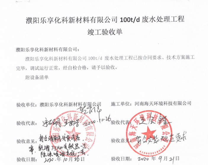 項目從2020年6月30日開工,在夏天高溫炙烤下,施工現(xiàn)場人員不怕苦、不怕累趁熱而上,加班加點按時完成項目的安裝。經(jīng)過我公司技術(shù)人員專業(yè)技術(shù)的調(diào)試下,廢水于9月7日達(dá)標(biāo)出水。項目于10月26日經(jīng)過業(yè)主竣工驗收。