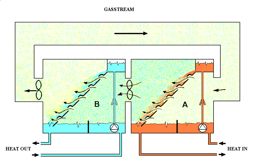 技術(shù)原理:液體順著傾斜的平板流動,由于空化作用平板下方產(chǎn)生微小的負(fù)壓,平板上表面出現(xiàn)凸口。負(fù)壓使得空氣從平板下方進(jìn)入流動的液體中,當(dāng)長氣泡與液體長時間接觸后變成飽和水蒸氣,交換其他液體中溶質(zhì)或者熱量。低壓風(fēng)機輸送空氣并加強氣液的接觸,提高反應(yīng)效率。