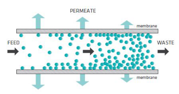 陶瓷膜分離工藝是一種“錯流過濾”形式的流體分離過程:原料液在膜管內(nèi)高速流動,在壓力驅(qū)動下含小分子組分的澄清滲透液沿與之垂直方向向外透過膜,含大分子組分的混濁濃縮液被膜截留,從而使流體達到分離、濃縮、純化的目的。