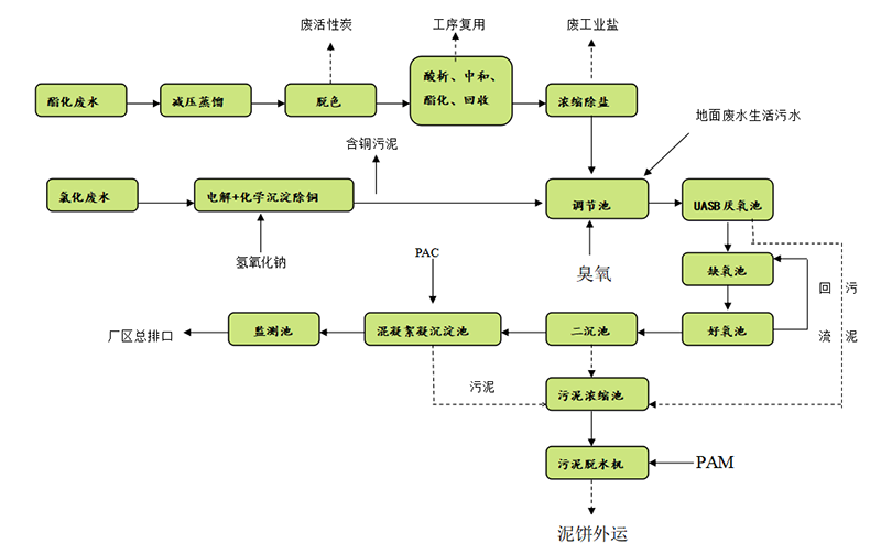 源頭減量+污水按性分組+精混物沉+濃縮或多級(jí)氧化預(yù)處理(催化微電解+多相電化學(xué)+納米臭氧+催化氧化)+調(diào)理生化+MBR+UF/RO/NF