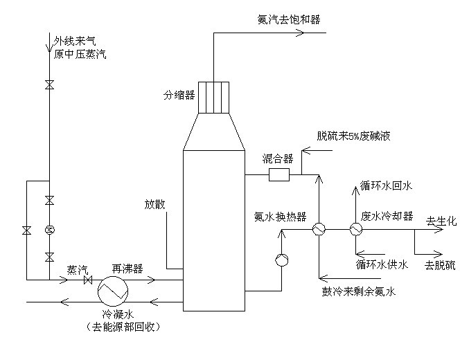利用蒸餾原理,依靠外部熱源將剩余氨水中的氨蒸出,降低剩余氨水的氨氮含量。剩余氨水經(jīng)過廢水換熱器與蒸氨廢水換熱后進入蒸氨塔上部與脫硫送來的5%NaOH廢堿液經(jīng)靜態(tài)混合器混合后入塔,外來蒸汽入再沸器加熱廢水,廢水汽化產(chǎn)生的蒸汽與入塔的剩余氨水逆向接觸換熱,將固定銨分解,氨汽蒸出,塔頂氨汽經(jīng)氨分縮器冷卻后全部入飽和器前煤氣中,蒸氨廢水用泵打出經(jīng)氨水換熱器、廢水冷卻器冷卻后大部分送往酚氰廢水處理站(以下簡稱生化),少部分進脫硫去配5%NaOH溶液,循環(huán)利用。